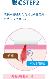 今までの脱毛理論では、毛根にある毛母細胞が毛を作り出すという理論でしたが、最近の研究ではバルジ領域という部分が「毛を作れ」という信号を出していることがわかりました。当サロンではこのバルジ領域の働きを止める最新の脱毛「バルジ脱毛」を取り入れています。バルジ領域は毛根よりも表皮に近いので、照射する光も従来に比べて弱く、痛みもお肌への負担も軽くなります。